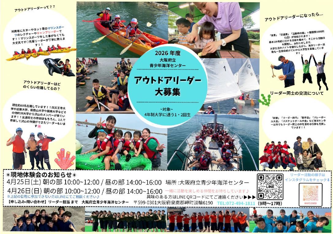 2026年度 アウトドアリーダー募集中 海洋センターでは大学生のアウトドアリーダーを募集しております募集内容などの詳しい内容についてはチラシでご確認ください。